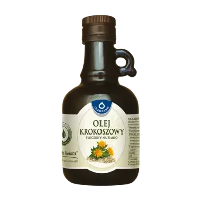 Olej krokoszowy tłoczony jest na zimno z nasion krokosza barwierskiego. Polecany jest do stosowania na zimno do surówek, sałatek, dipów, sosów i past.